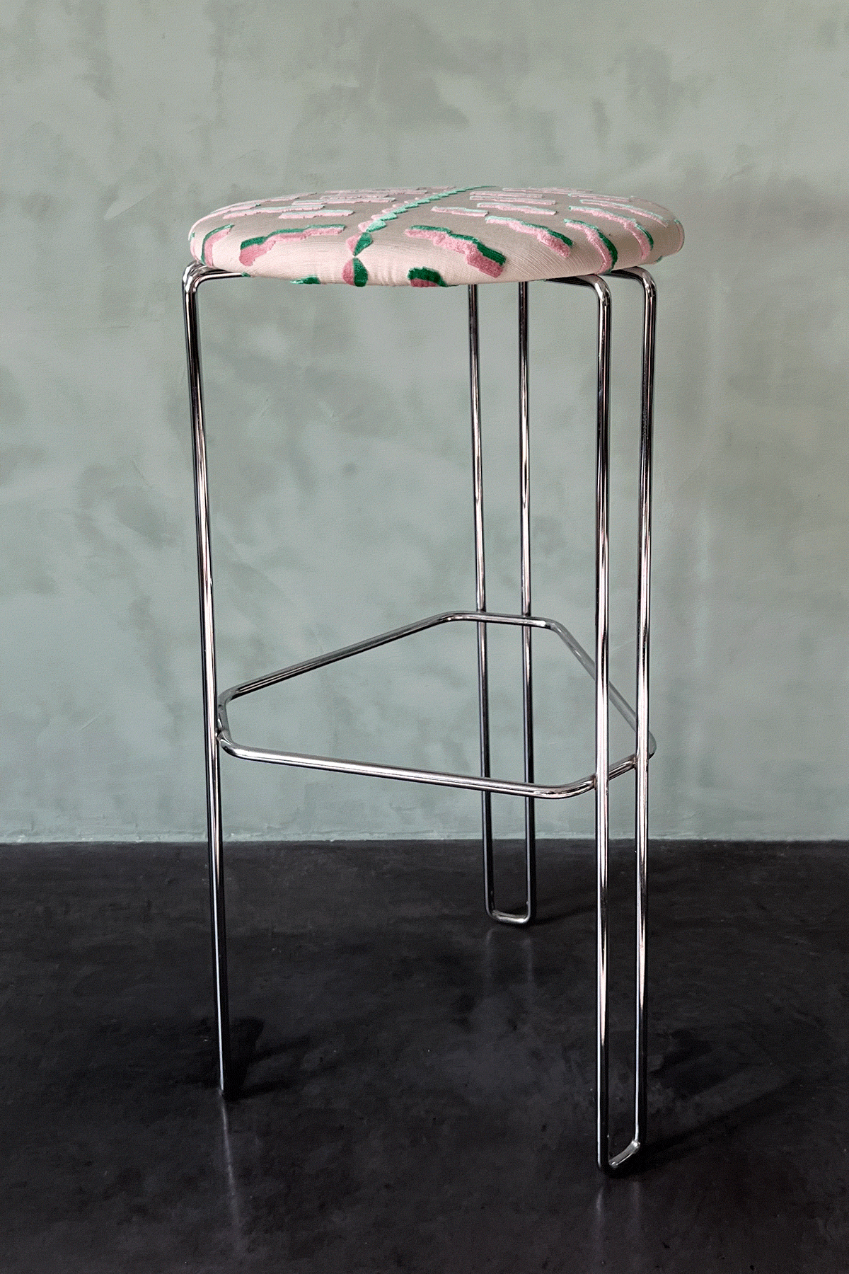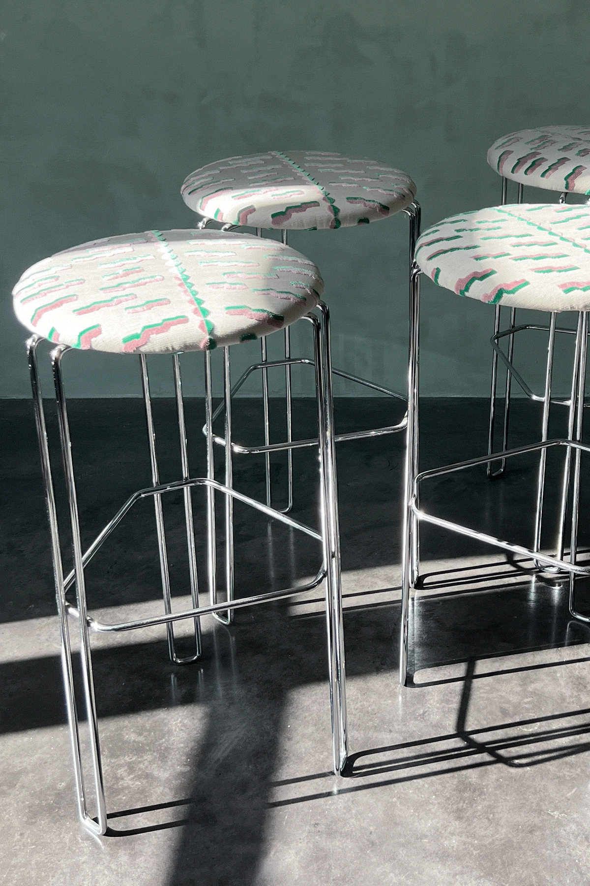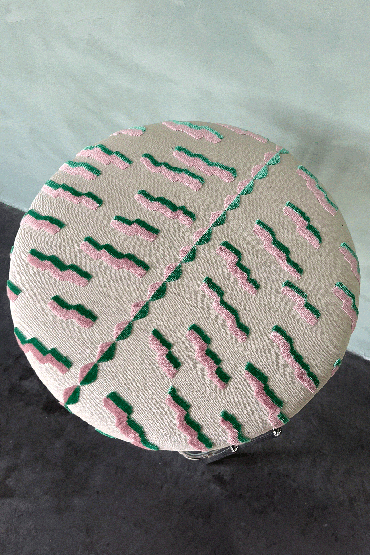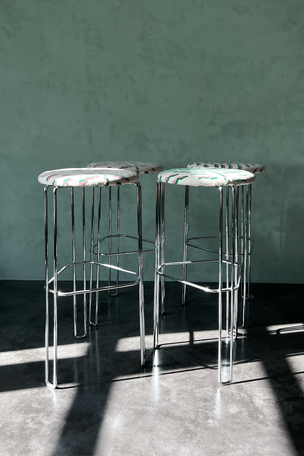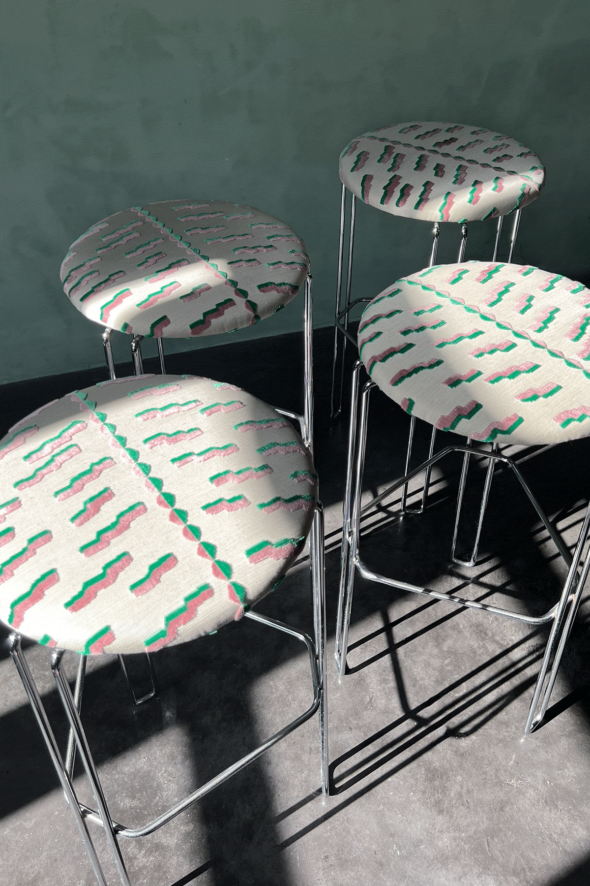 Ils ont été restaurés par Atelier Biermann, les galettes ont une nouvelle mousse et un nouveau tissu pour un look plus lounge, plus chic, plus fun. Référence tissu Dedar Milano, Tiger Beat, dans sa version vert et rose.